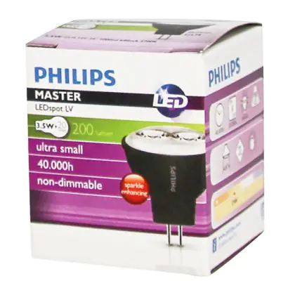 Puoi risparmiare fino al 90% di energia e mantenere I costi di manutenzione veramente al minimo, grazie al basso consumo di soli 3.5W e una durata della vita media utile di 40000 ore. Le tradizionali lampadine alogene GU4 hanno una durata di sole 2000 ore. Le lampade LED non emettono raggi IR e UV che sono dannosi e non produce calore! Installare questa lampadina è molto semplice: tirare la vecchia lampada GU4 e rimuoverla dall’attacco quando non è più calda. Infilare la nuova lampada GU4 nell’attacco. Questo è un prodotto di alta qualità Philips a partire da un prezzo di . Questa lampada viene fornita con una totale garanzia di 5 anni da Lampadadiretta.it. Hai bisogno di una consulenza o di maggiori informazioni sulla tecnologia LED e sul potenziali risparmio energetico che può riservarti? Contatta i nostri esperti luce per una consulenza gratuita: !